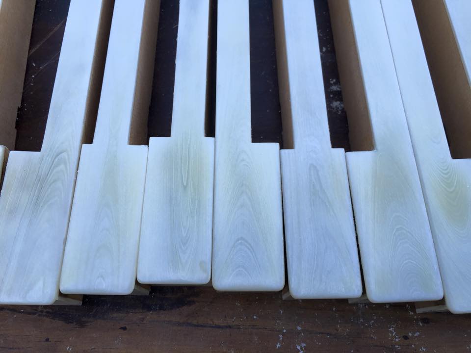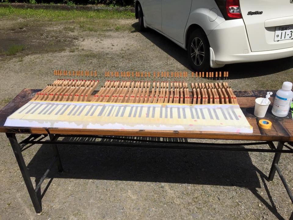 和紙を被せ過酸化水素水塗布を数回。 随分白くなりましたね。反りのある鍵盤を数本接着補修。