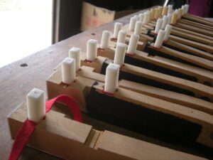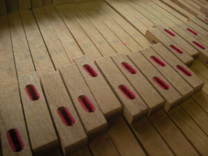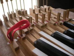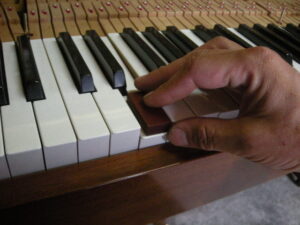 鍵盤高さをナラシ定規で測定します。数種類のペーパーの出し入れで鍵盤高さを面一に揃えます。