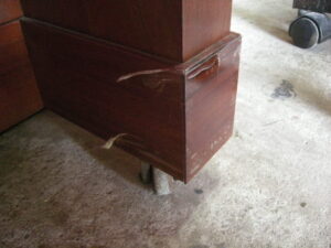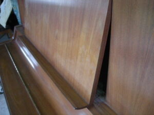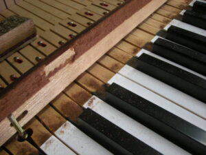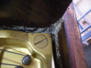 妻土台の剥がれをテープで止めてあります。 変色白鍵木口。 鍵盤抑えクロス虫食い。