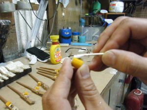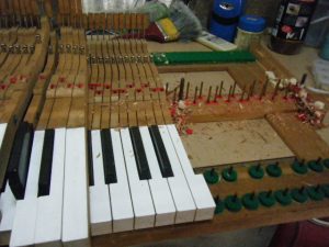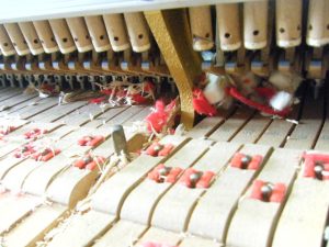 木製の鍵盤押さえが途中が齧られ無くなっています。同じように木製のサポート・ジャック、ハンマーヘッド等いたるところが被害に合っています。さてさて、個別でパーツが手に入るか?作業の開始です!!