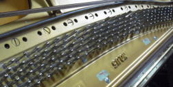 弦外し。徐々に緩め次に巻き線から外します。巻き線は業者に送り同じものを作って貰います。 プレッシャーバー外し。