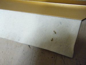 パネルを外しました。 虫食いによる赤と緑のフェルト粉カス。 マフラーも虫食い。