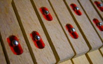 角度を考えながらピン板を傷つけないように穴あけです。 新品シルバーメッキピン。