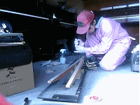 チューニングピンの打ち込みは脳天に響きますのでイヤーマフを着用。シルバーメッキピンは綺麗ですね!!