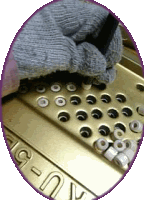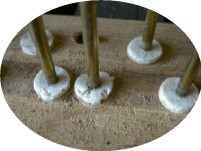 針を刺してフェルトの緊張をほぐします。これをしないと良い音はでません。いろいろな調整をしていきます。