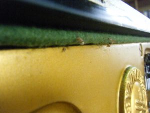 緑の粉は屋根とフレームの間の緑のフェルトの虫食い粉。虫脱皮殻。