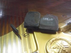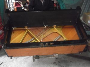 横になったピアノ。 底板を外しました。 ペダルパーツ分解。