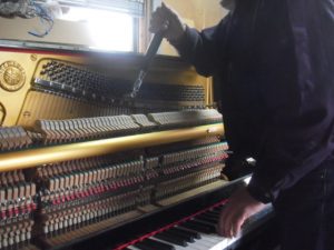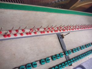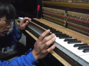 鍵盤がハンマーを動かし弦に当たるまで無駄なく正確に動くように調整します。
