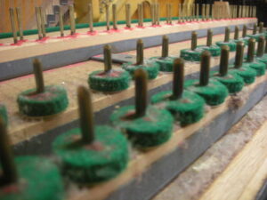 アクション取付後整調開始。 鍵盤高さはナラシ定規で測定、数種類のペーパーの出し入れで調整。