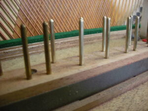錆と変色した弦。 ハンマーです。 ピアノを専用馬で倒します。