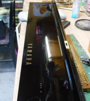 鍵盤蓋をポリッシャーで磨きます。 こんなに光りました。 ロゴも光ってます。