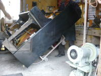 ピアノを倒します。 底板を外すのですがビスが硬い〜、ようやく外れました。