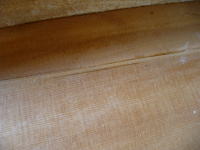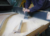 割れに沿って穴を広げます。 そこへスプルース材で埋め木します。 カンナで面一に削ります。