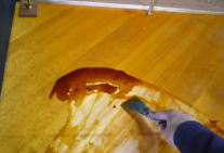 剥き出しになった響板。 ギトギトになった塗膜。 シンナーで剥します。