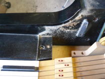 鍵盤下の棚板は埃まみれ。 バランスピンは少しの錆。 フロントピンは白く艶がありません。