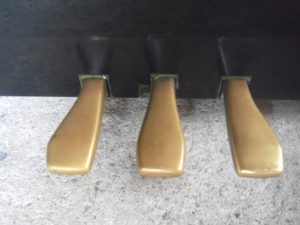 艶もありませんね。 真鍮製の上口金とペダルは変色しています。