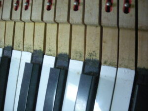 蝶番も変色。 鍵盤蓋も艶がありませんね。 最終調律令和20年。