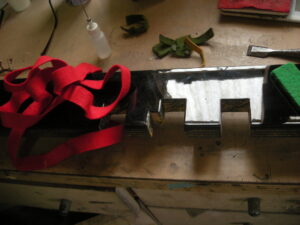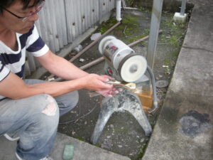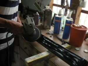 サンドラバーを使い手でゴシゴシと弦を磨きます。 ピッカピカ!!