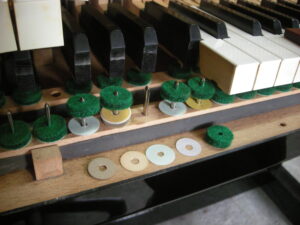 鍵盤高さはナラシ定規を使い数種類の丸いペーパーの出し入れで上面高さを揃えます。