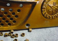 プレッシャーバーの折れたビスを抜きました。ビス穴を広げて抜くので埋め木をします。ボンドを落とし埋め木を打ち込みます。