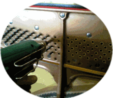 チューニングピン抜き 馬でピアノを倒します。 ここの底板をはずします。