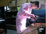 時間が勿体ないと会場で弦を外し始めるあけみさん。お客さんの視線を感じながら巻き線を外し束ねていきます。